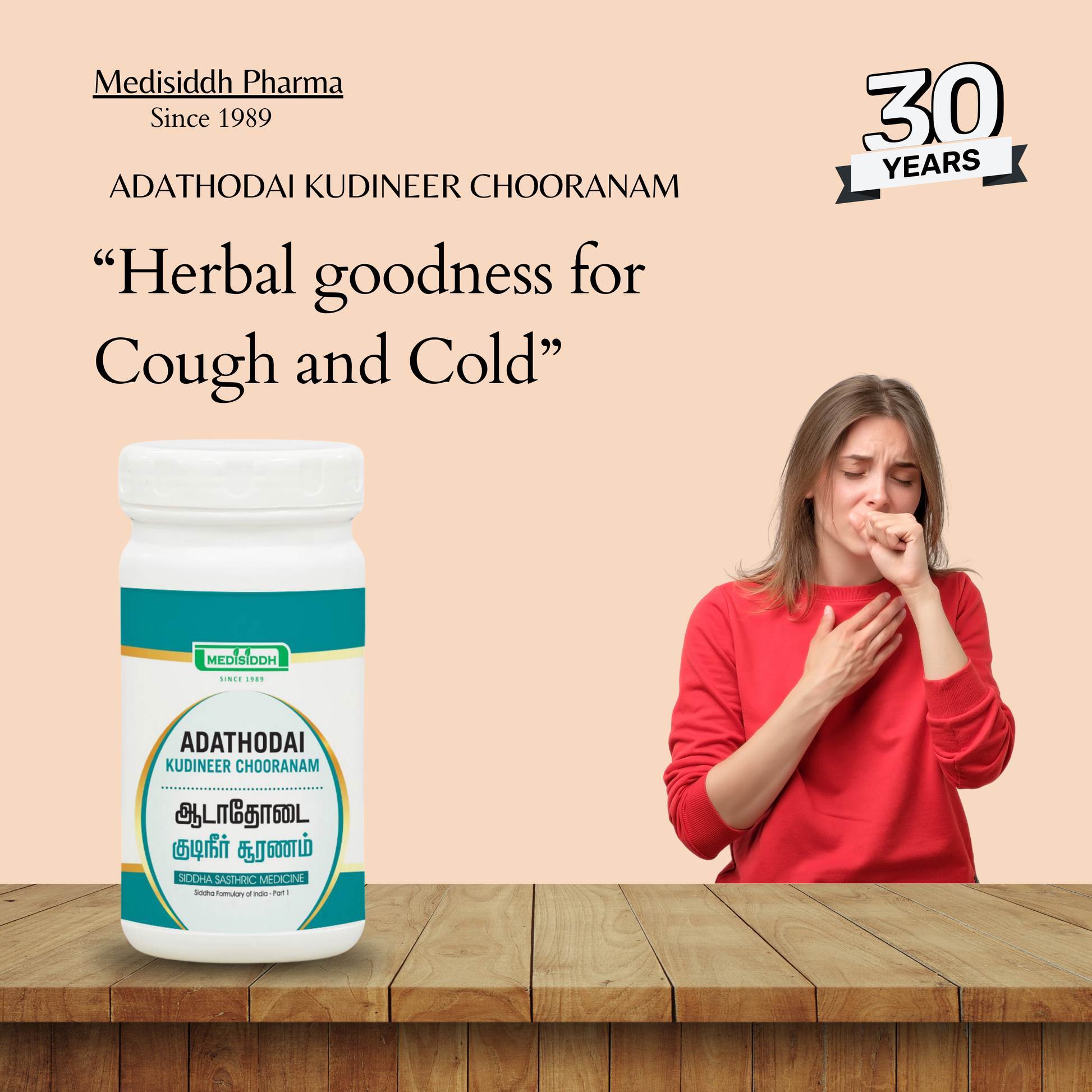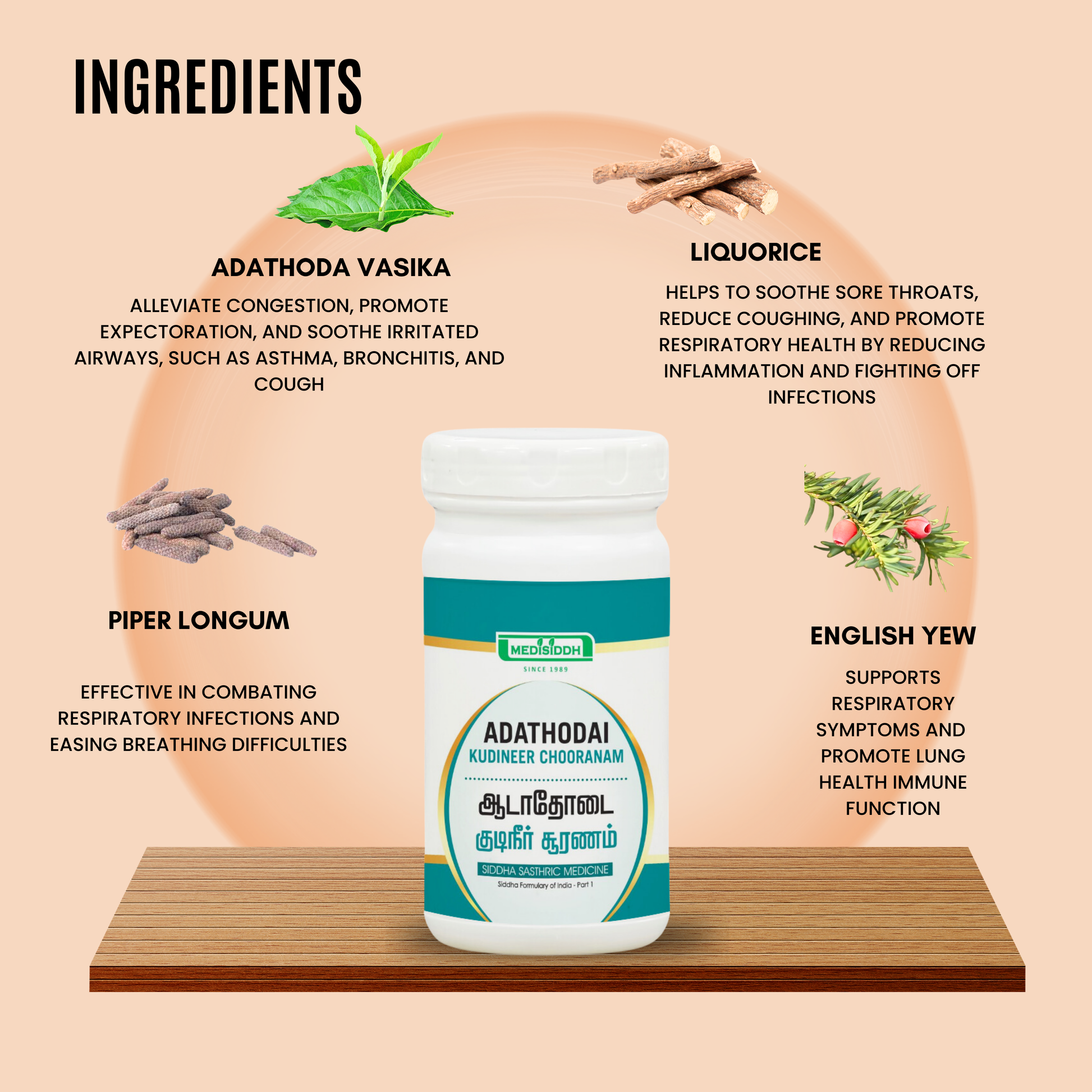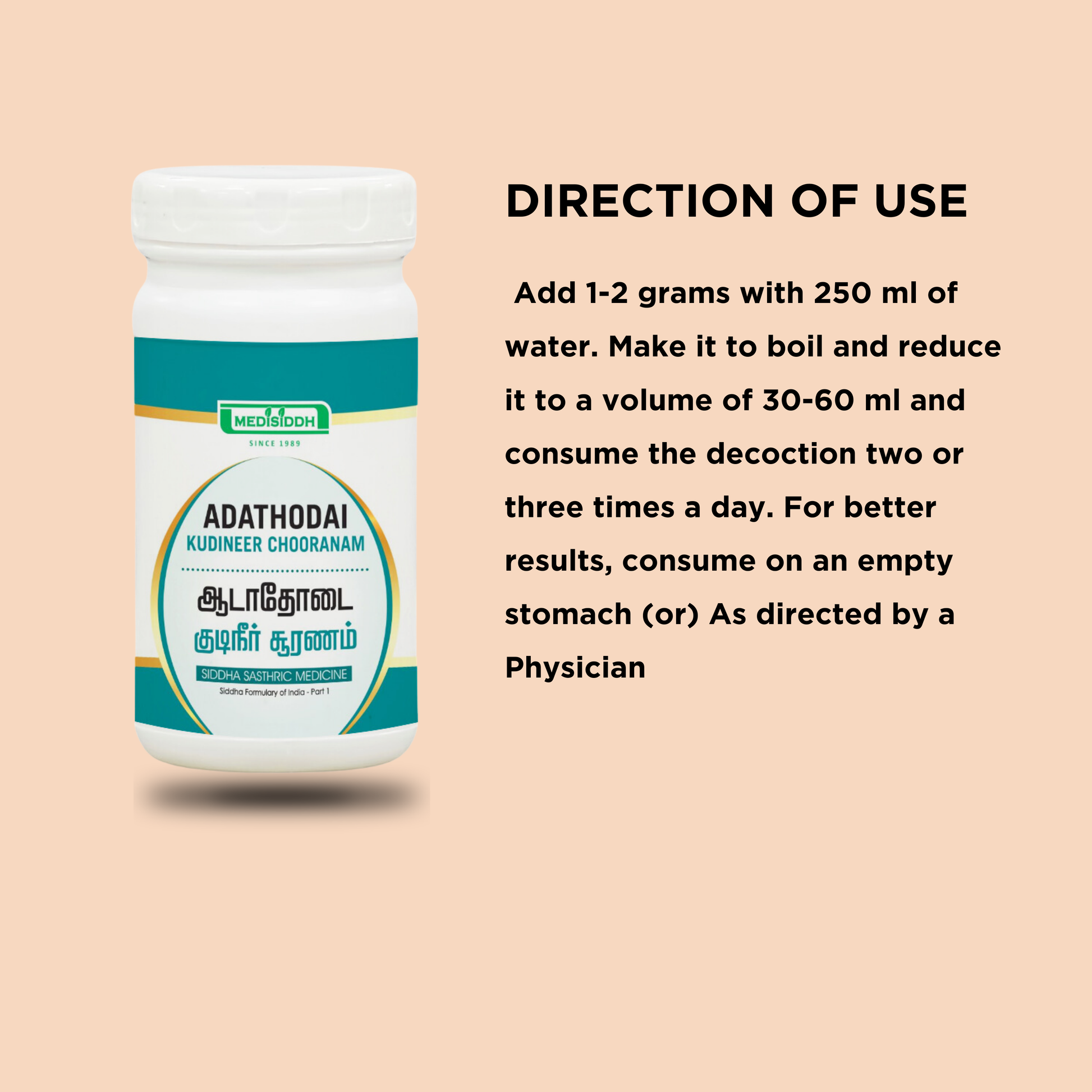 Adathodai Kudineer Chooranam is primarily used for its potential benefits in managing respiratory issues, such as cough, cold, asthma, and bronchitis.