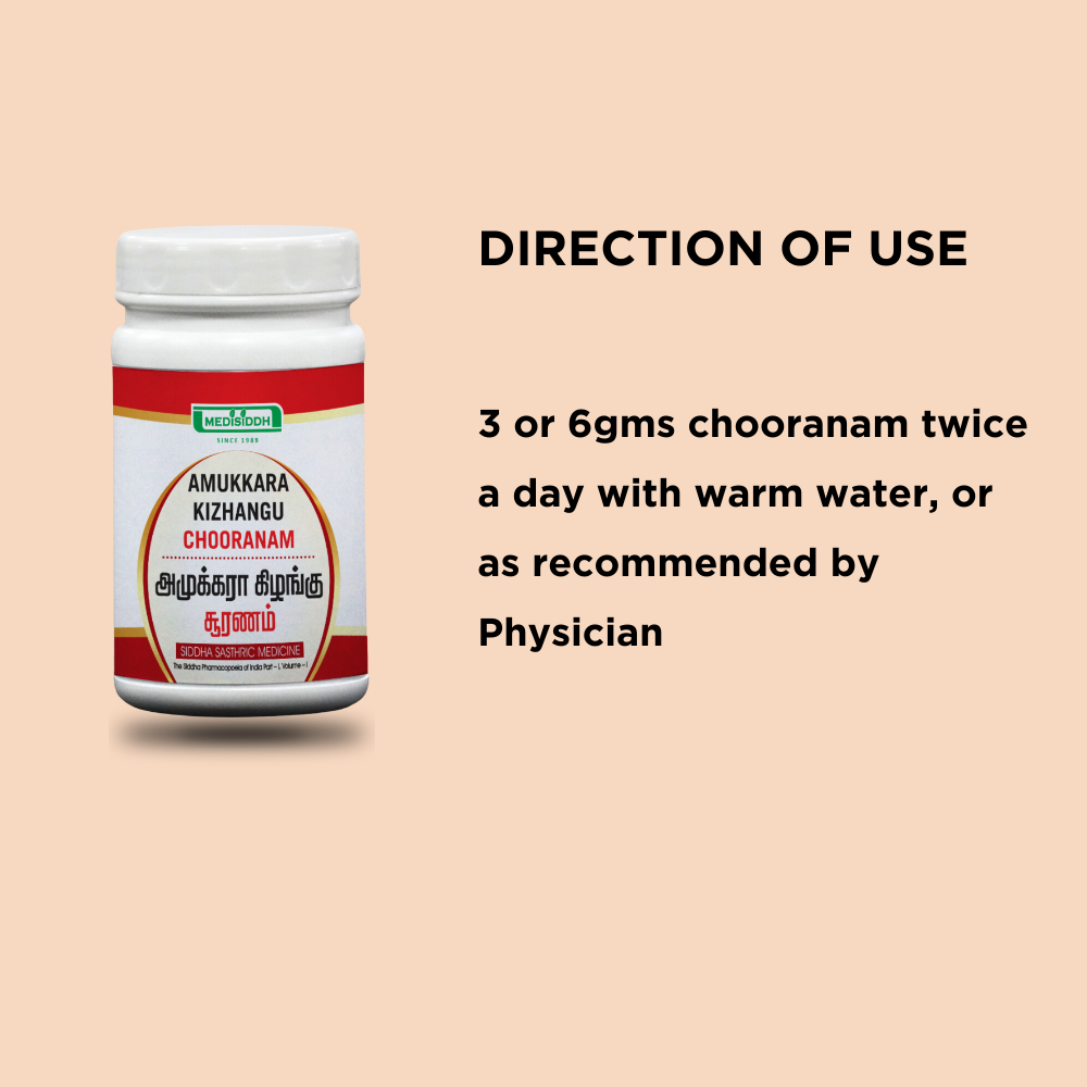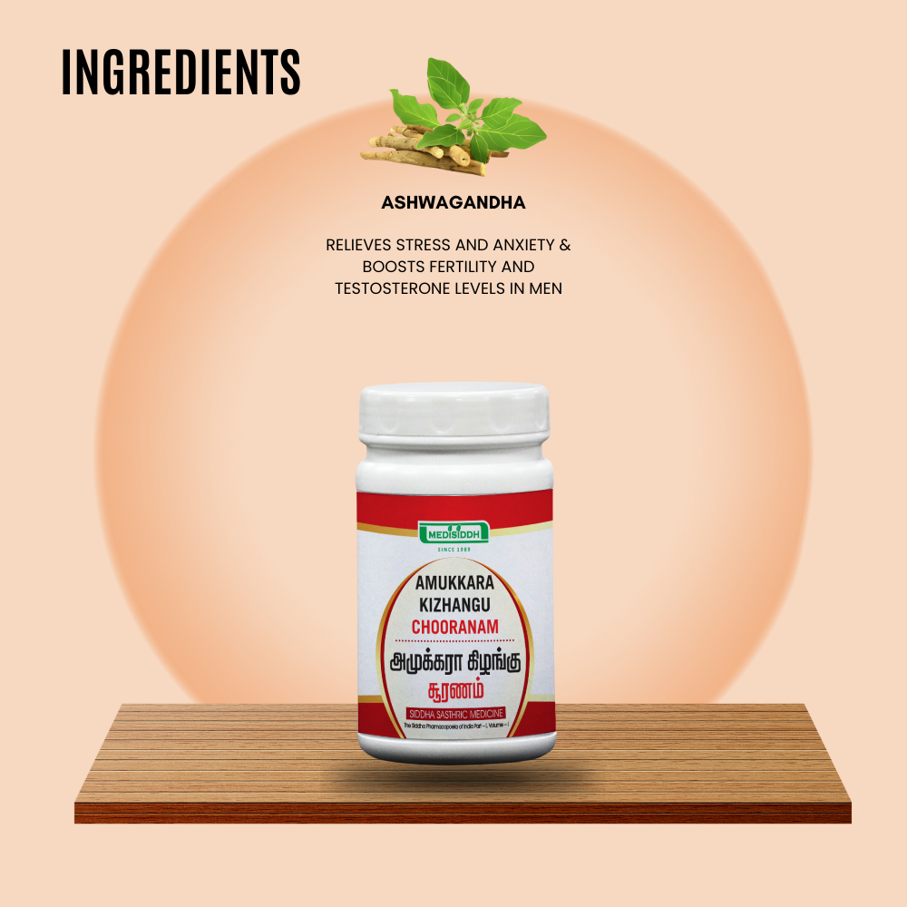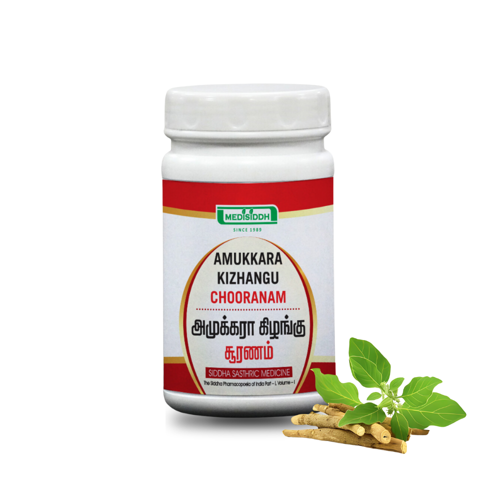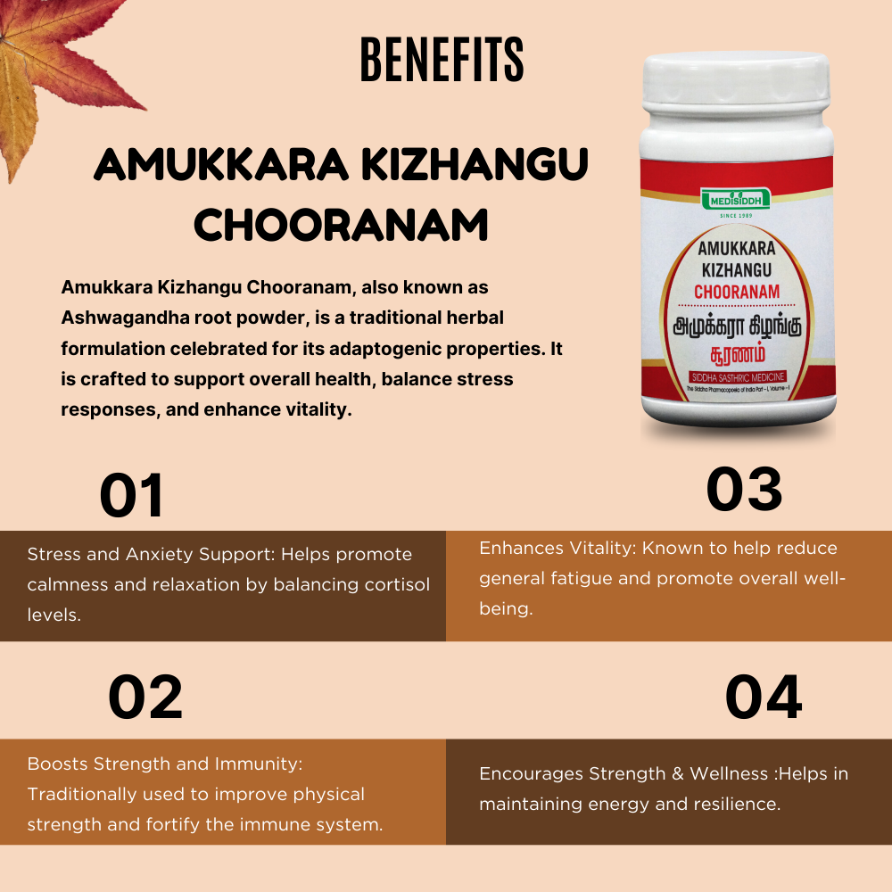 Amukkara Kizhangu Chooranam, also known as Ashwagandha root powder, is a traditional herbal formulation celebrated for its adaptogenic properties. It is crafted to support overall health, balance stress responses, and enhance vitality.