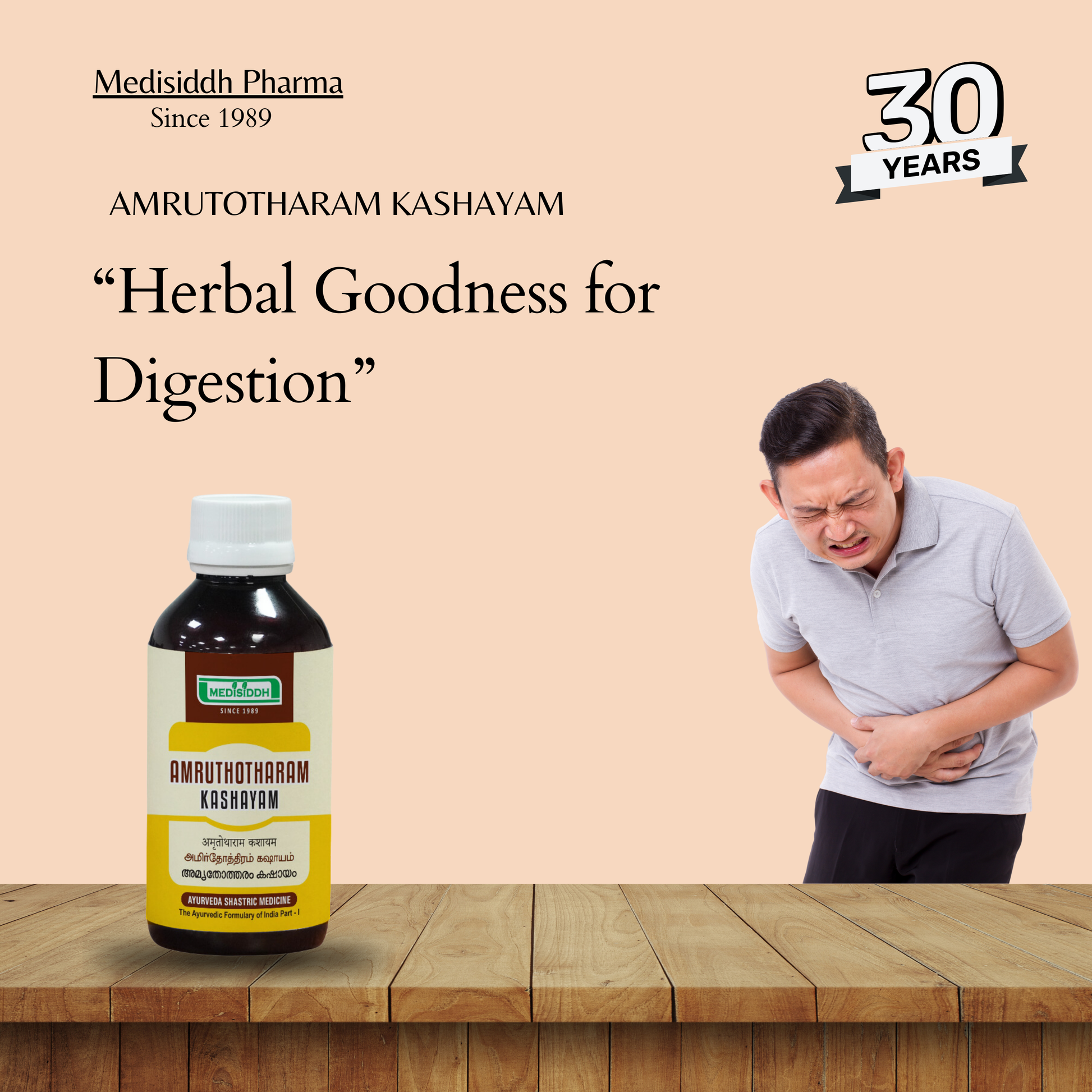 Medisiddh Amrutotharam Kashayam is a herbal preparation made with traditional ingredients like Zingiber officinale (Ginger), Tinospora cordifolia, and Terminalia chebula. This blend is crafted to support overall wellness and promote balance within the body.
