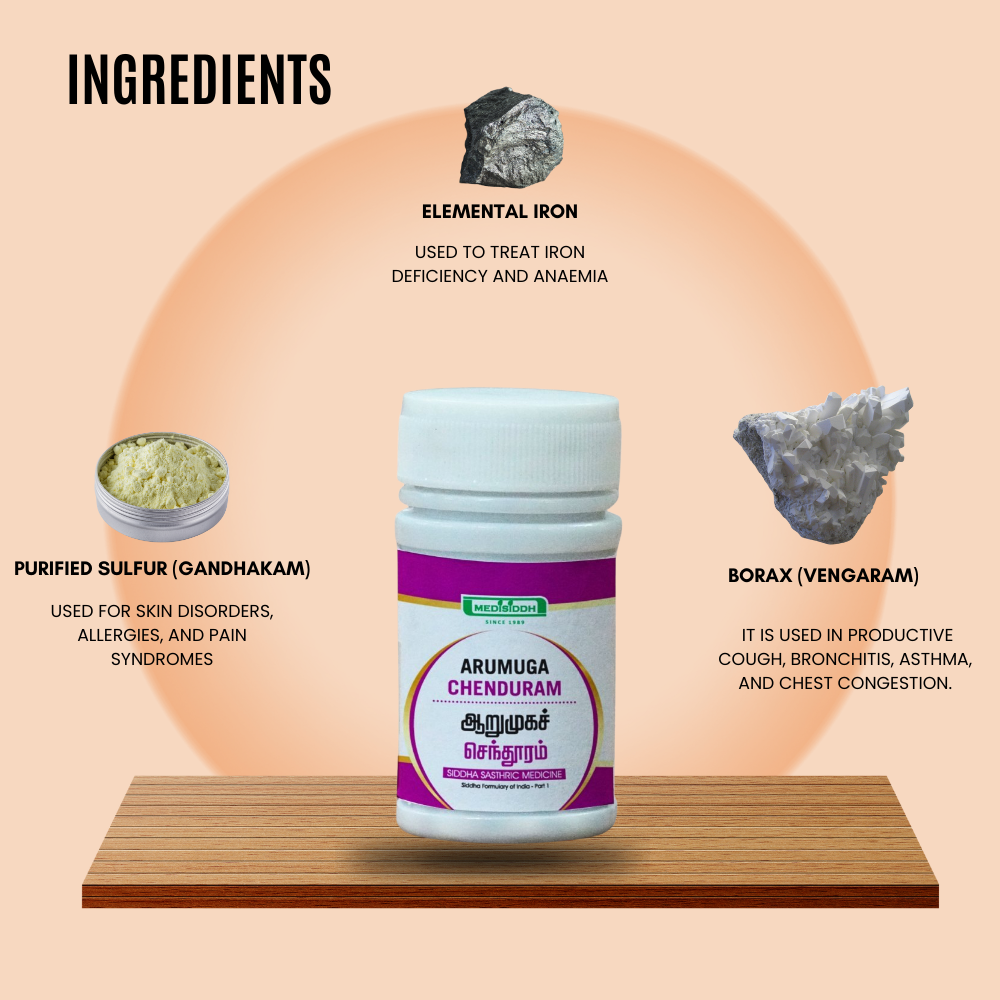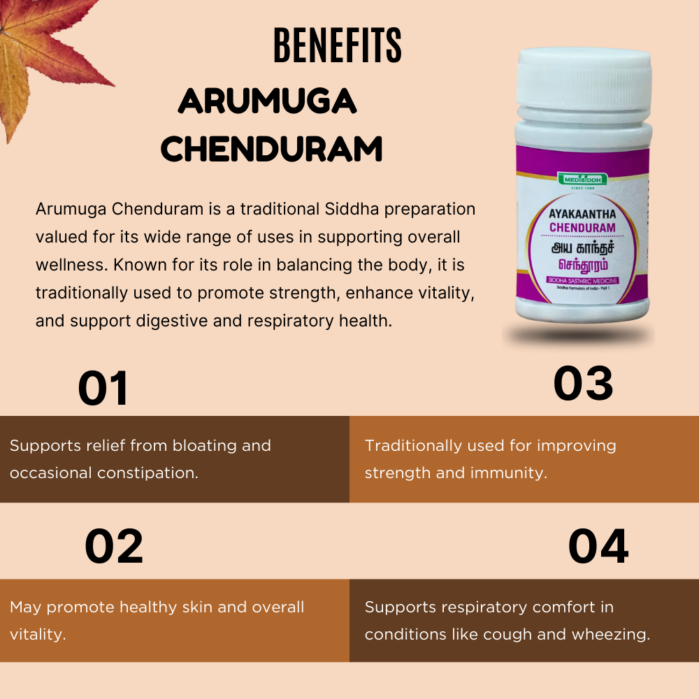 Arumuga Chenduram is a traditional Siddha preparation valued for its wide range of uses in supporting overall wellness. Known for its role in balancing the body, it is traditionally used to promote strength, enhance vitality, and support digestive and respiratory health.