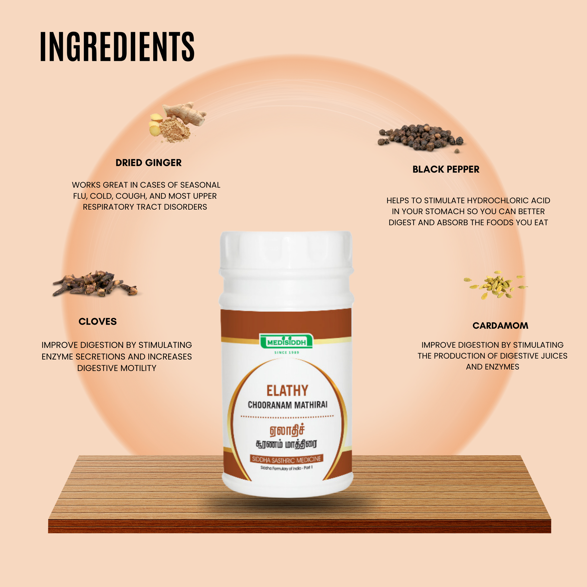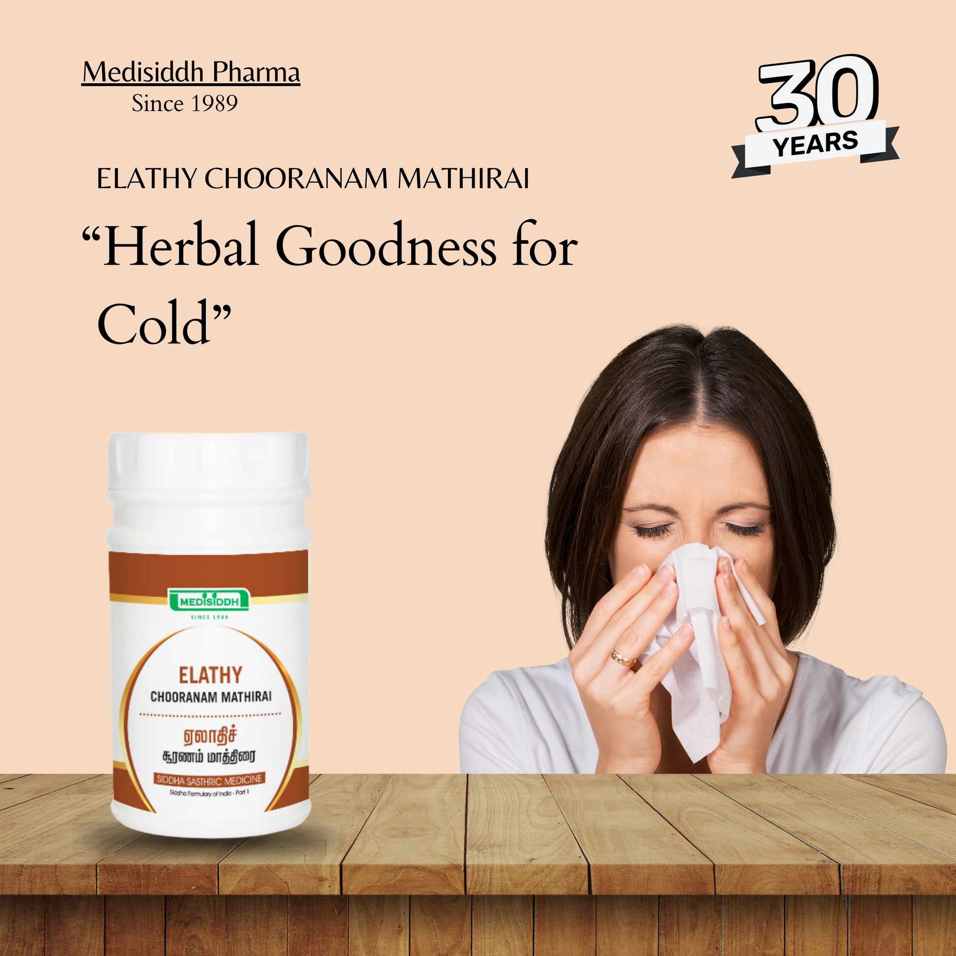 Elathy Chooranam Tablet is a Siddha medicine used to treat cough, cold, indigestion, skin issues, and urinary infections. It promotes clear, healthy skin and helps manage rashes, acne, pigmentation, and allergies.