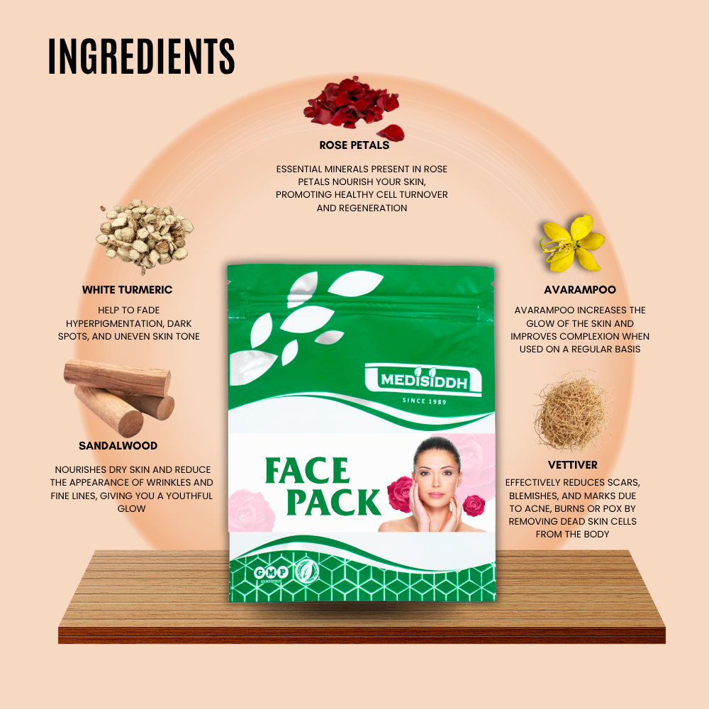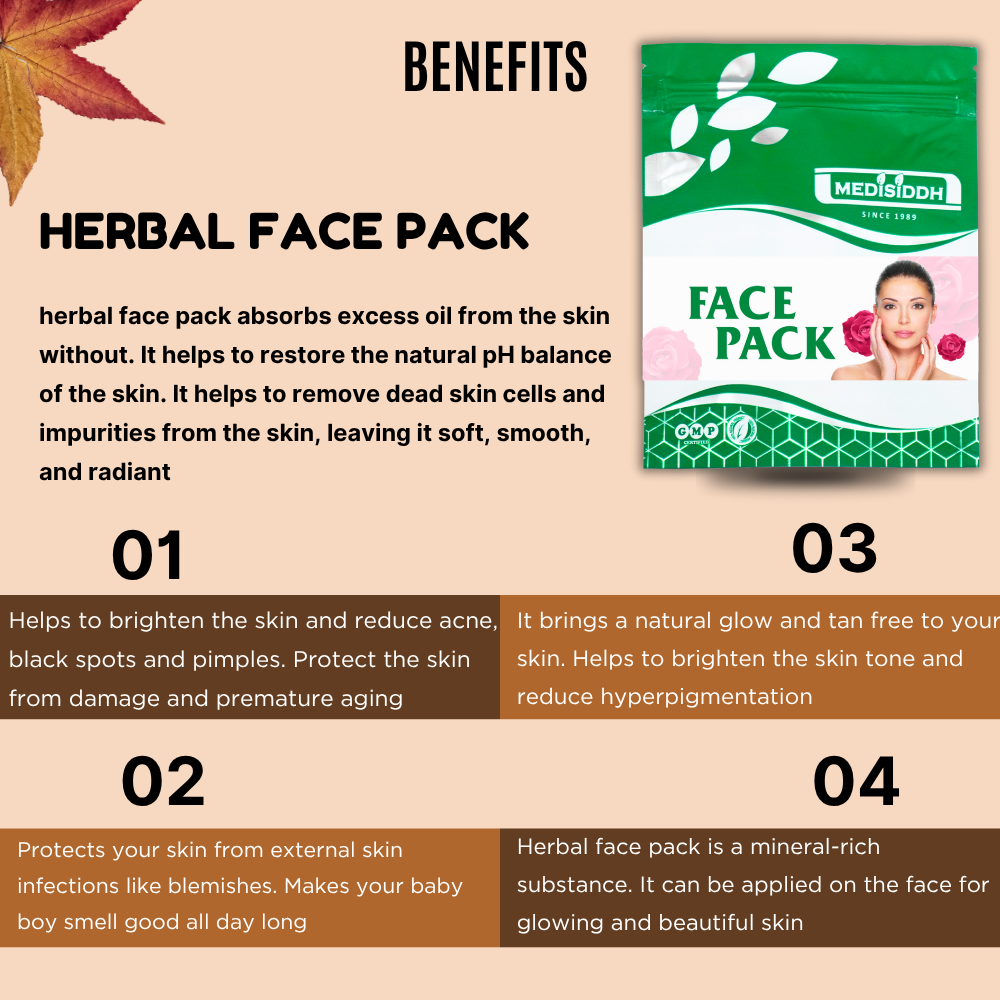 herbal face pack absorbs excess oil from the skin without. It helps to restore the natural pH balance of the skin. It helps to remove dead skin cells and impurities from the skin, leaving it soft, smooth, and radiant.