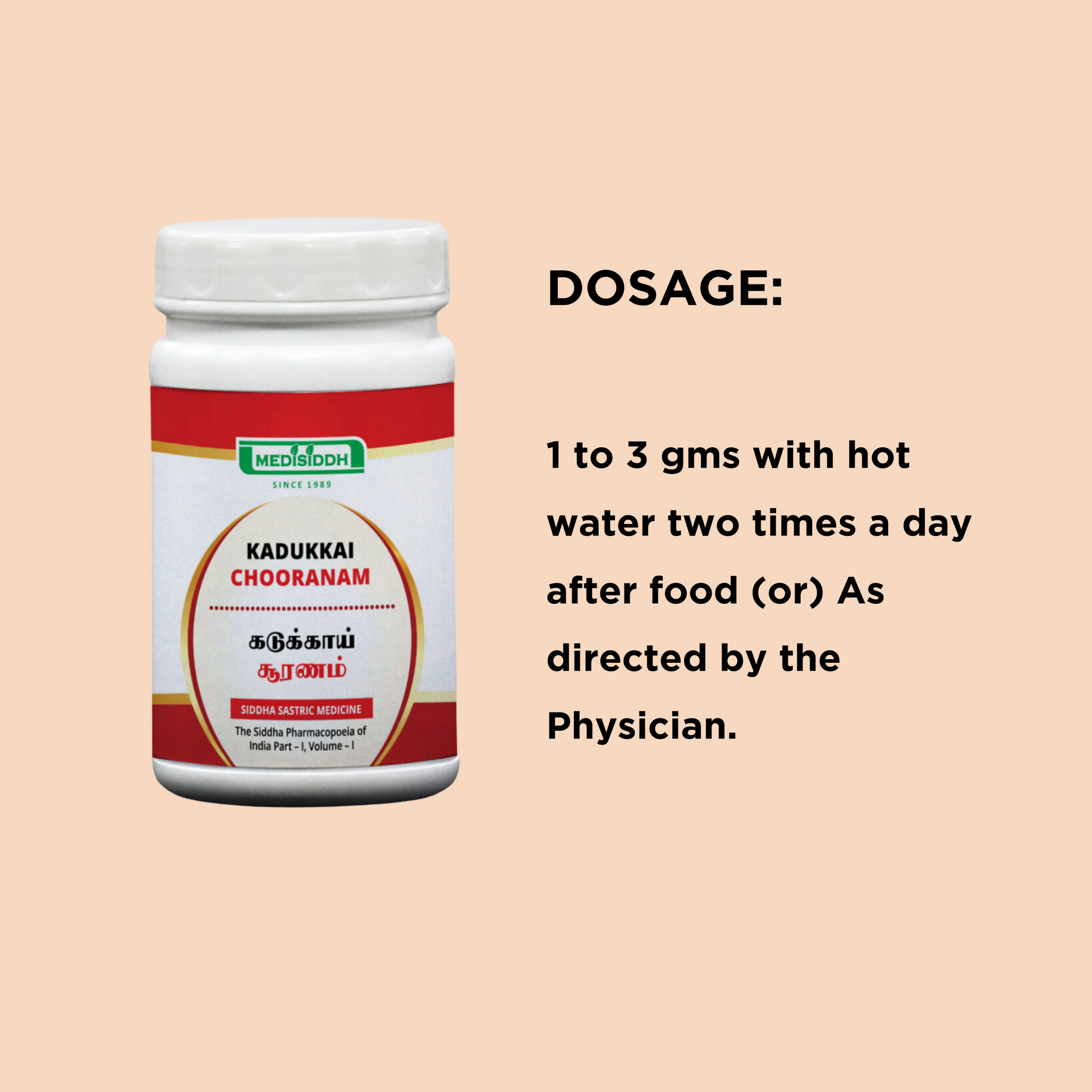 Kadukkai Chooranam is a natural laxative, tones up the digestive system, reduces acidity, improves appetite, improves digestion, regulates colon function and promotes proper assimilation of food.