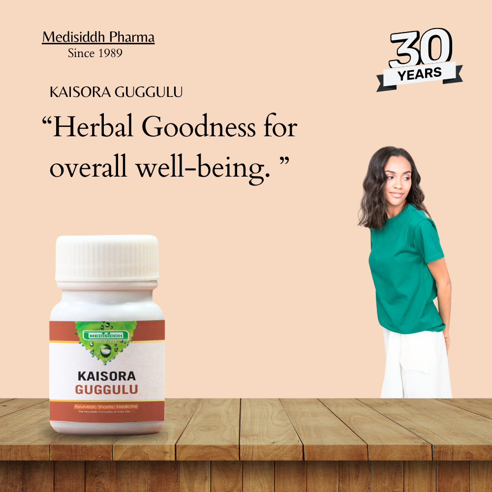 Kaishore Guggulu is a time-tested Ayurvedic formulation made with Guggulu resin, Triphala, and Guduchi. It is celebrated for its holistic support for detoxification, joint comfort, and overall digestive health, aligning with Ayurveda’s natural wellness principles.