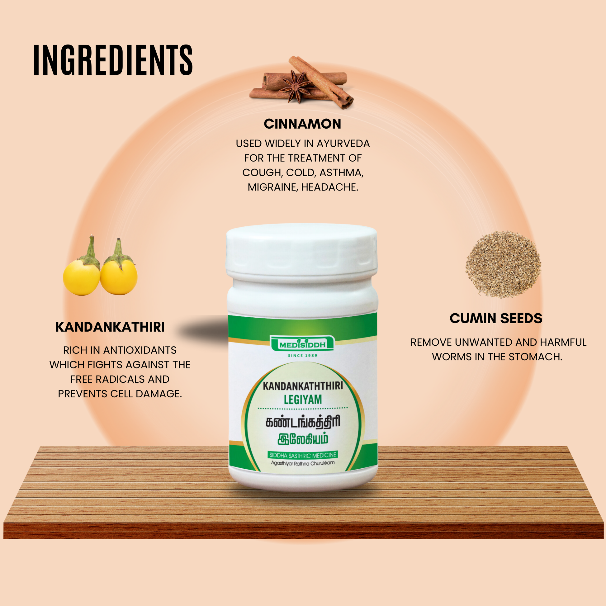 Kandankaththiri Legiyam is a traditional herbal blend made using time-honored ingredients known to support respiratory wellness.