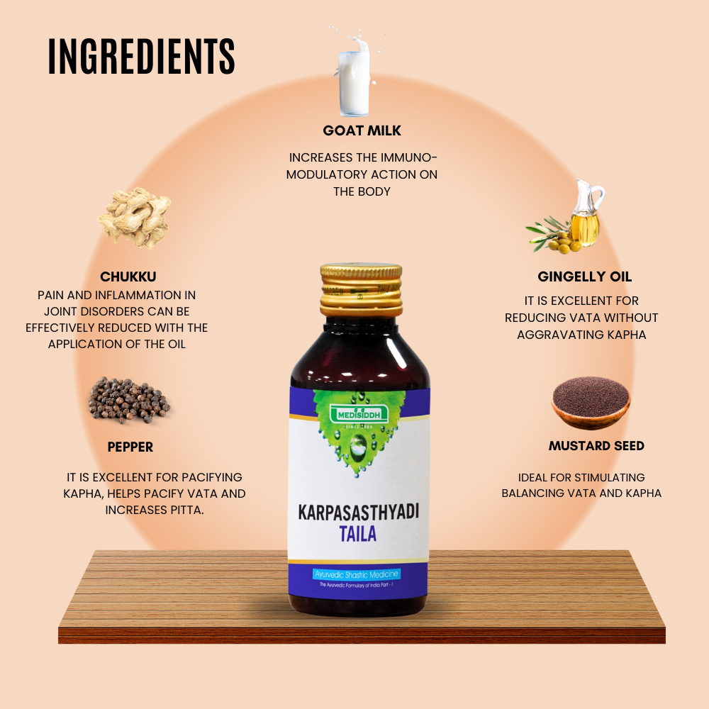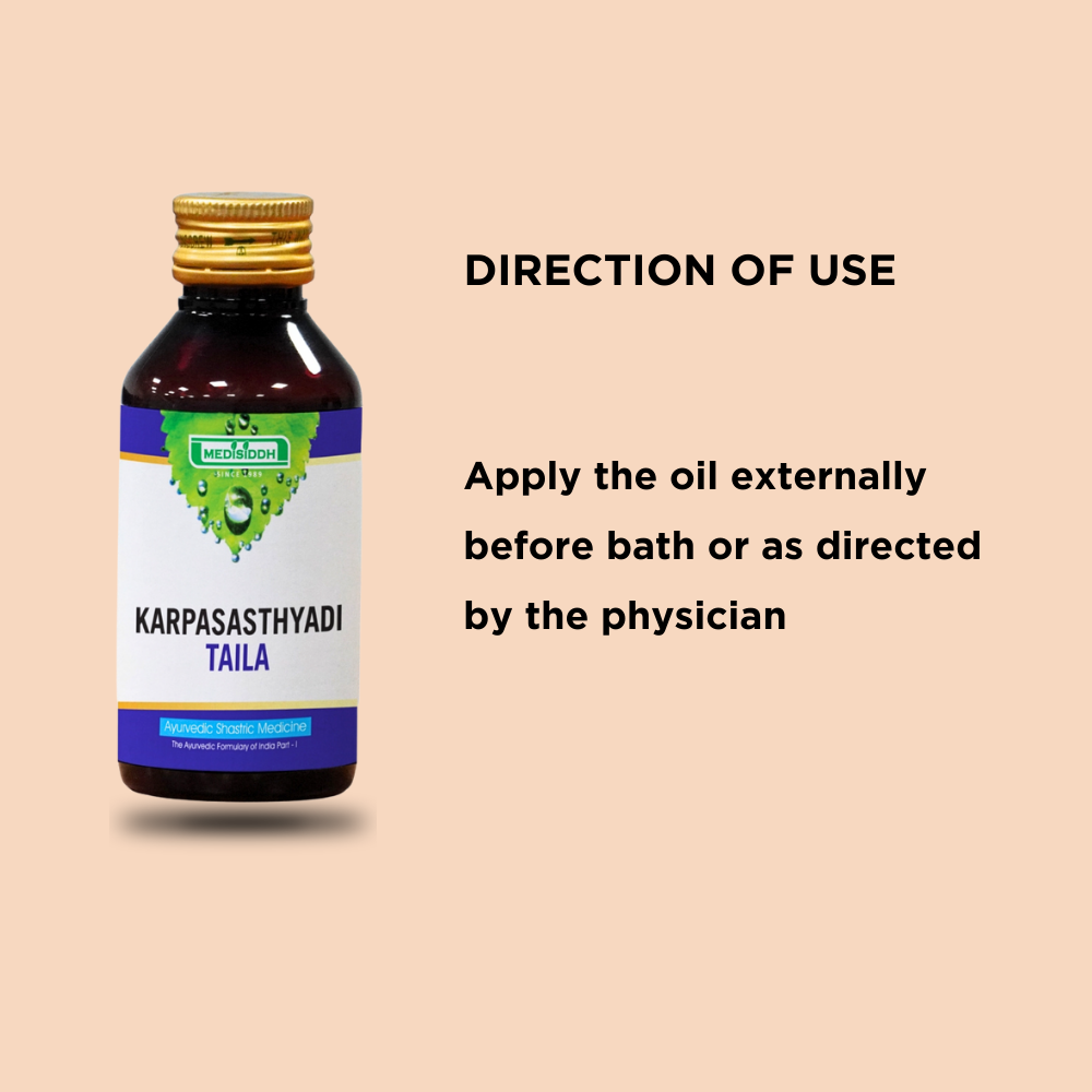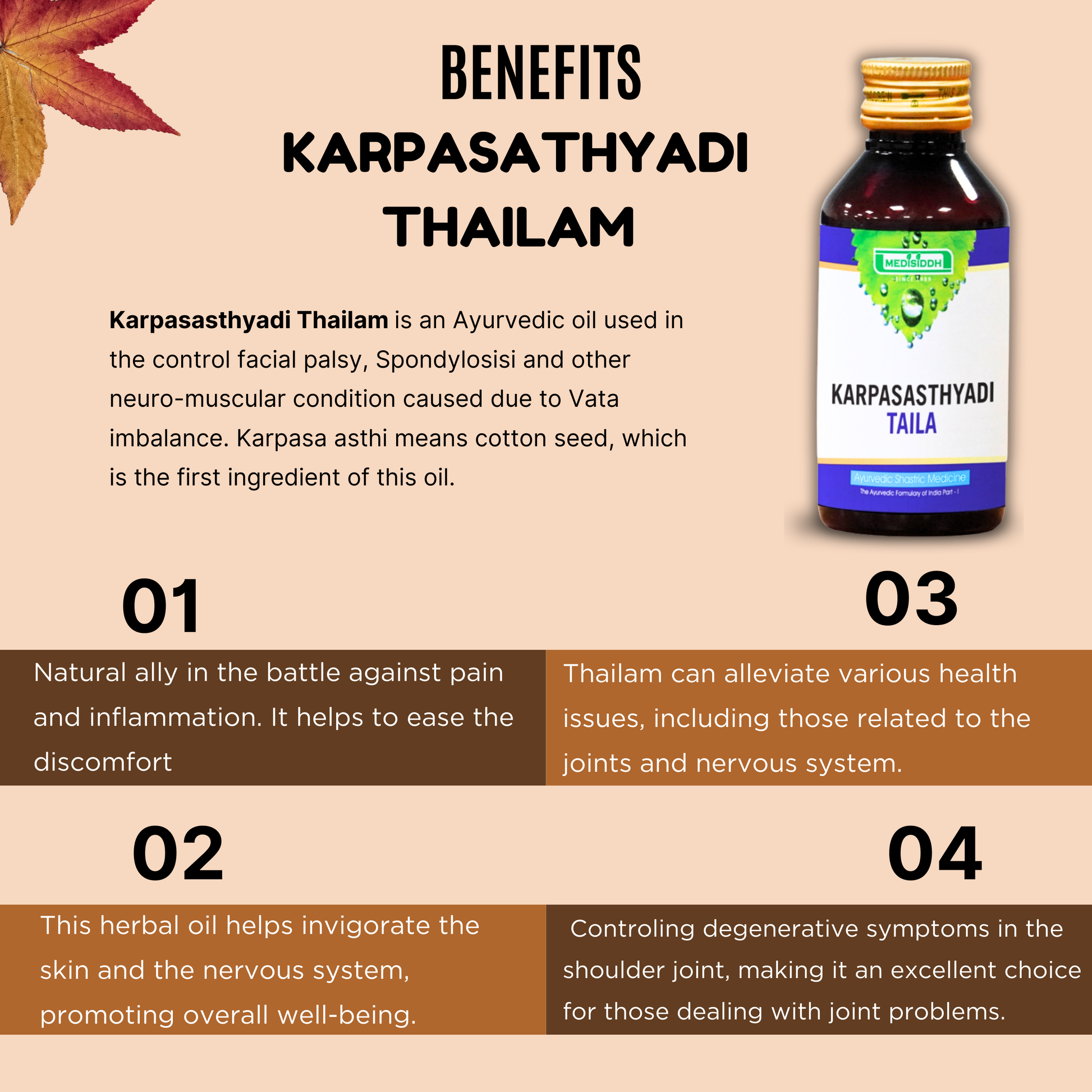 Karpasasthyadi Thailam is an Ayurvedic oil used in the control facial palsy, Spondylosisi and other neuro-muscular condition caused due to Vata imbalance. Karpasa asthi means cotton seed, which is the first ingredient of this oil.