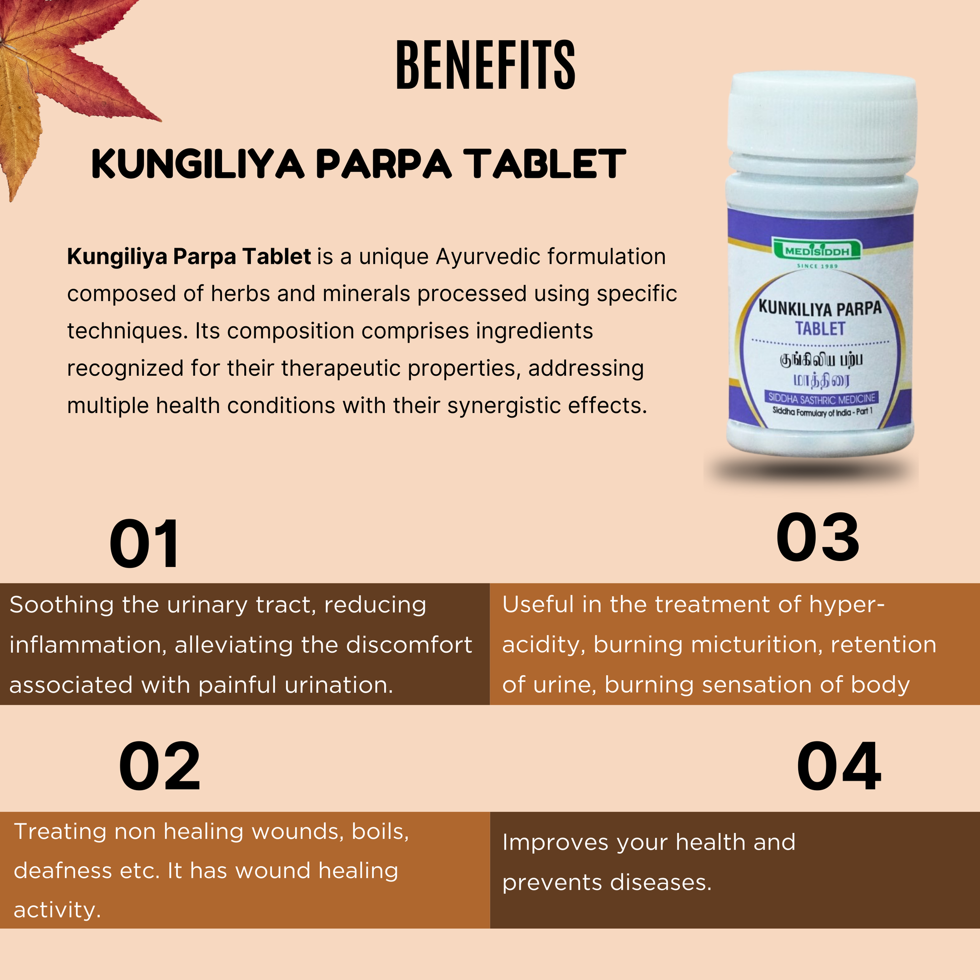 Kungiliya Parpam Tablet is a classical Siddha medicine in bhasman form. The resin is obtained from a tree called the Shala tree (Shorea robusta).