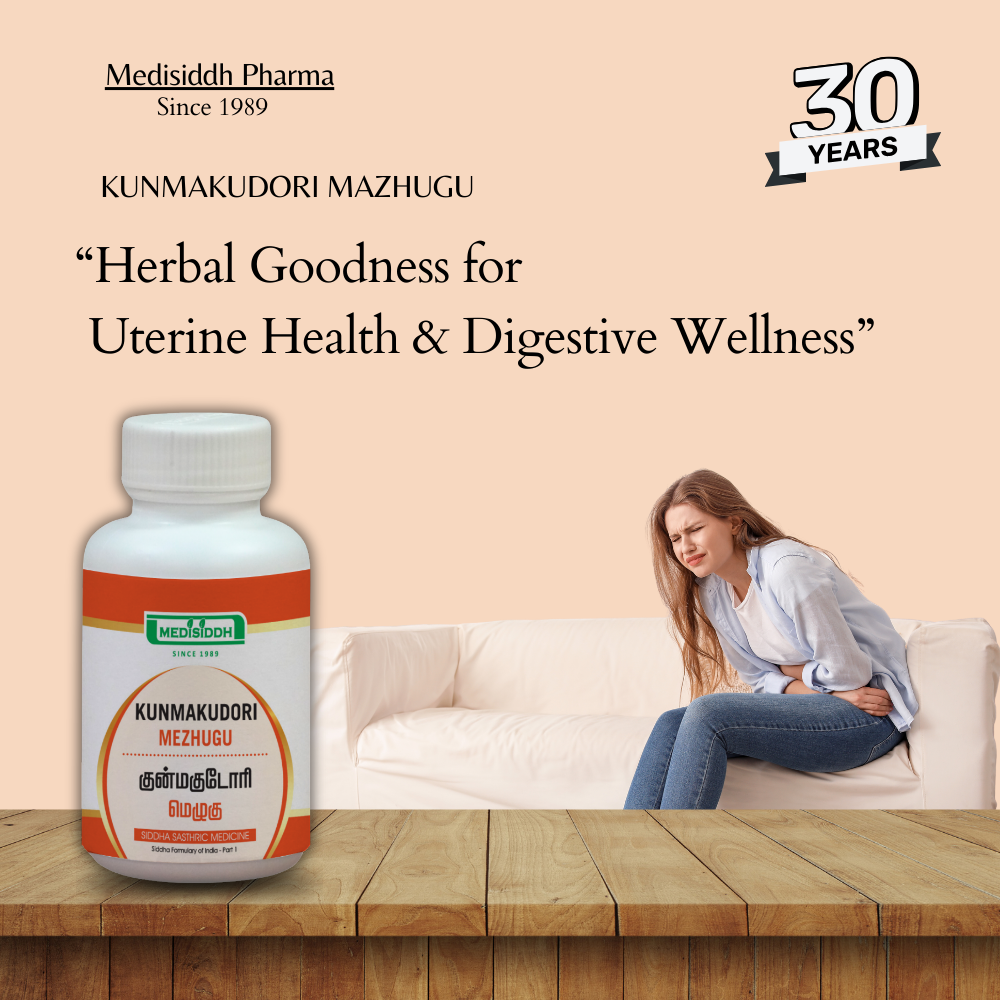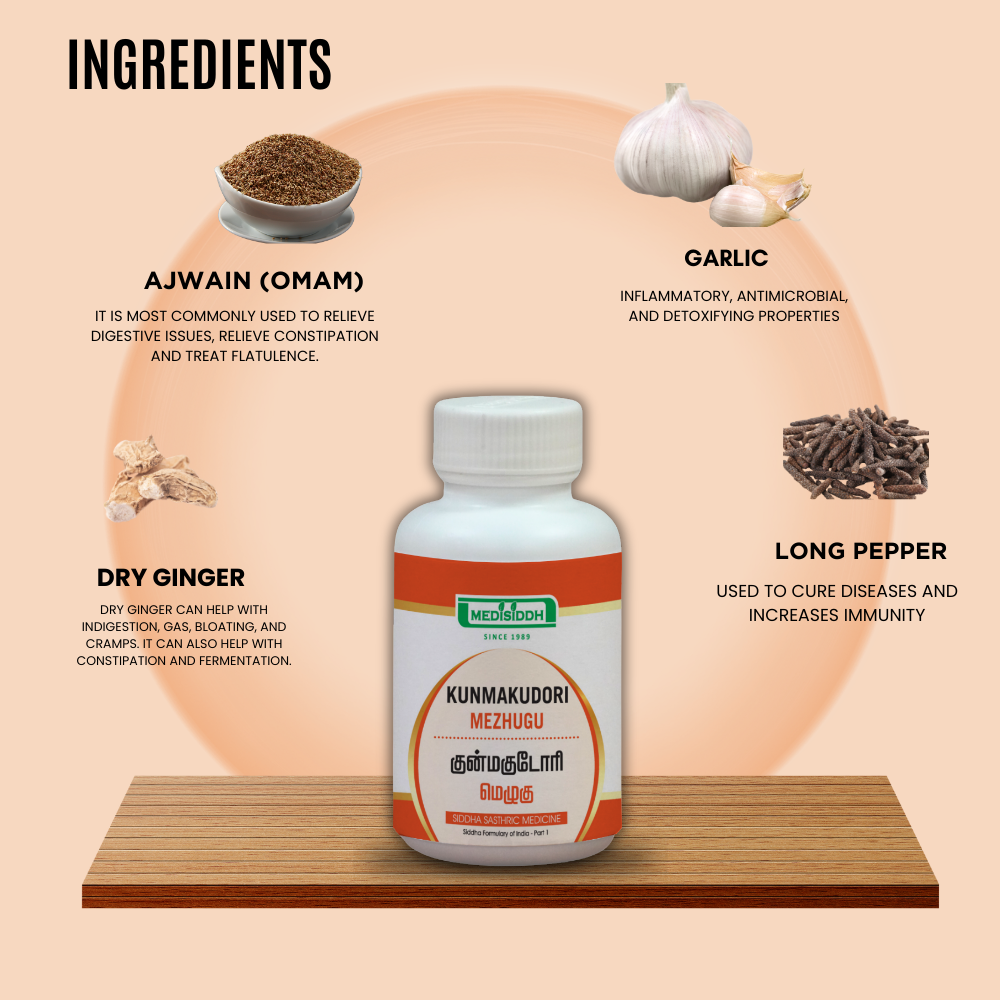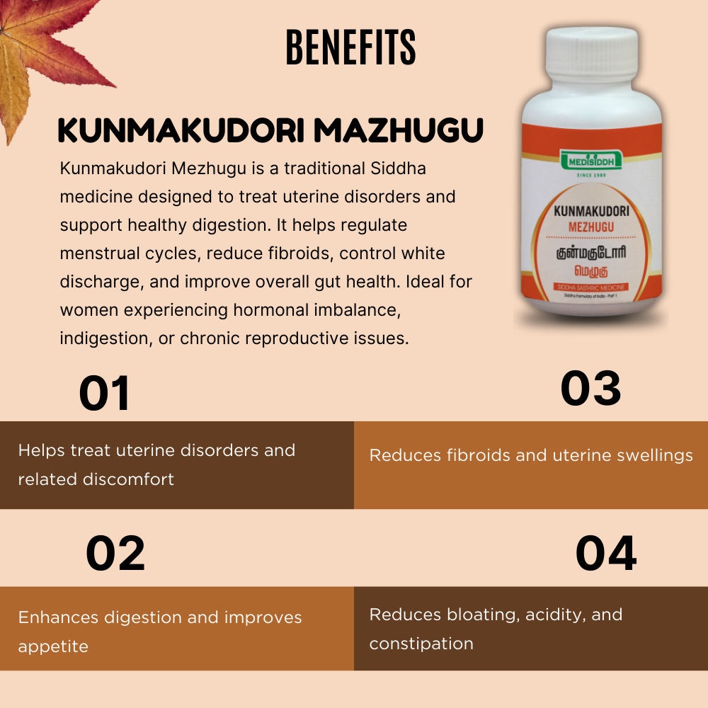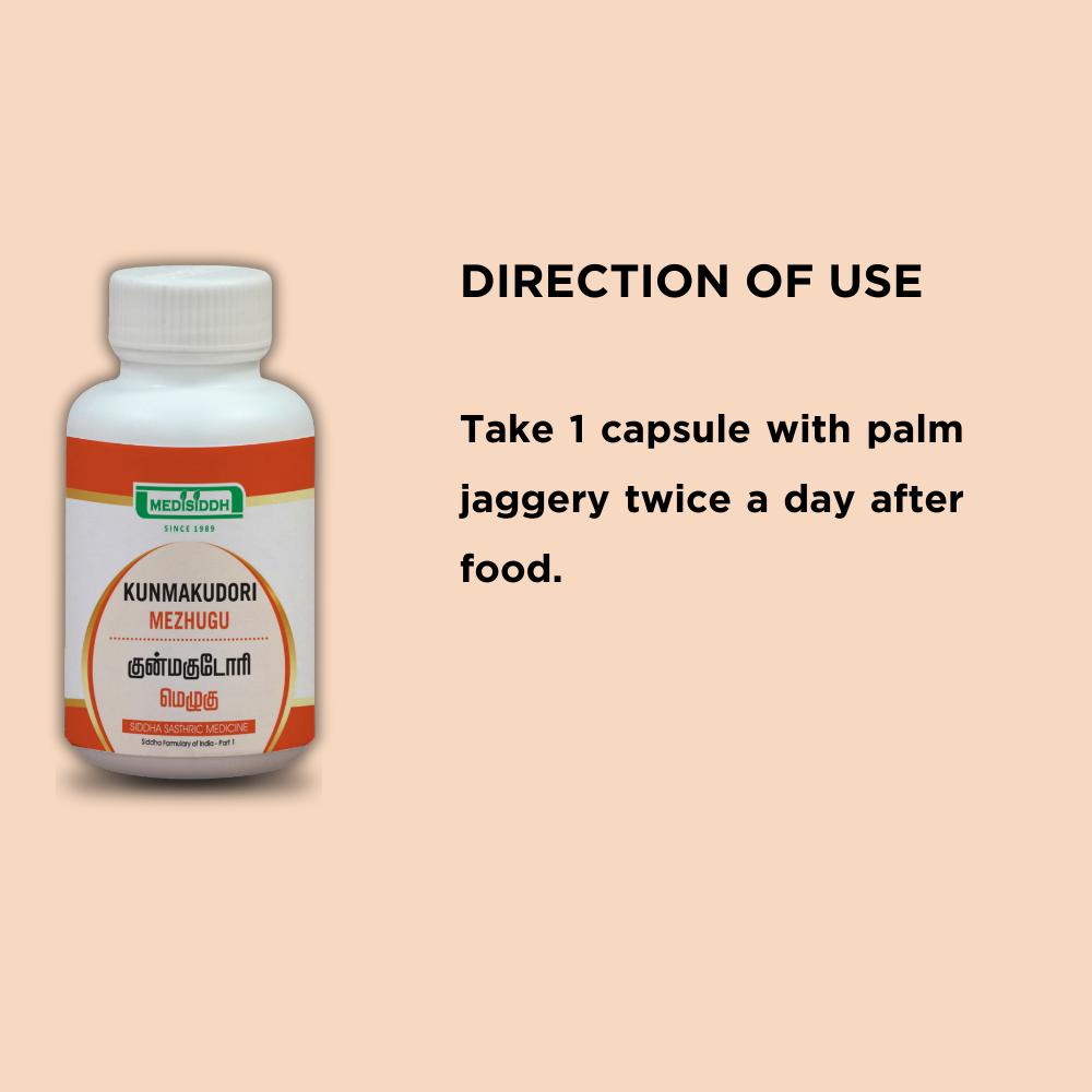 Kunmakudori Mezhugu is a traditional Siddha formulation crafted with natural ingredients, known for its potential to support women's wellness and digestive health. It is traditionally used to promote balance and well-being.