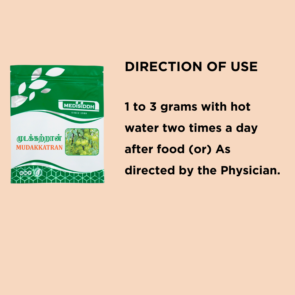 Mudakkatran is a trusted Ayurvedic remedy for pain relief, known for managing muscle pain, cramps, and joint stiffness. It helps reduce swelling, improve blood circulation, and promote healing, making it a go-to solution for chronic pain management and improved mobility.