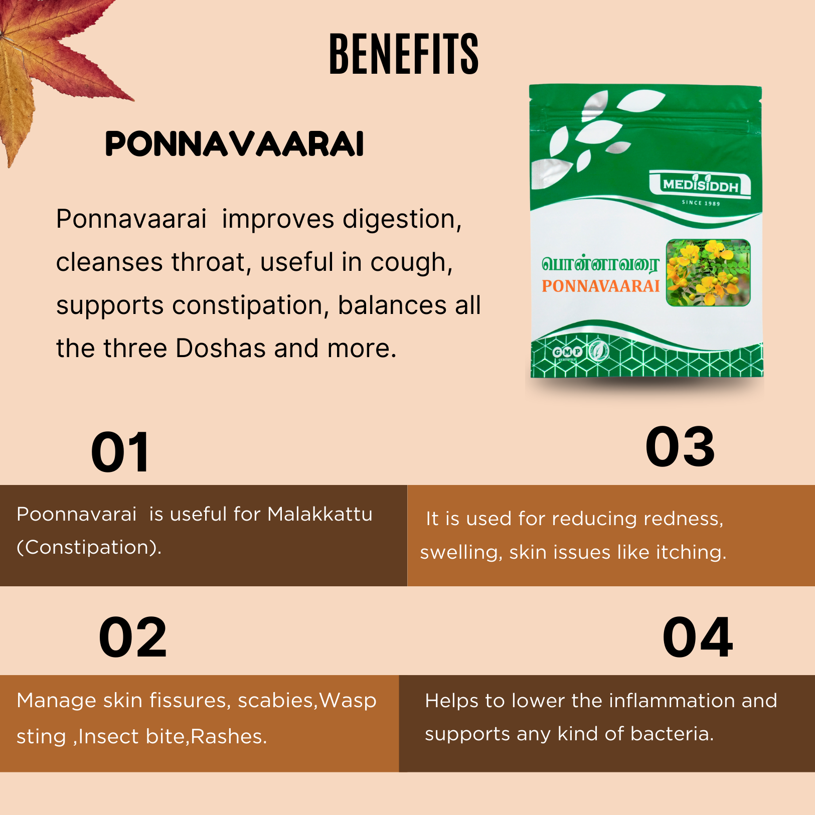 Ponnavaarai improves digestion, cleanses throat, useful in cough, supports constipation, balances all the three Doshas and more.