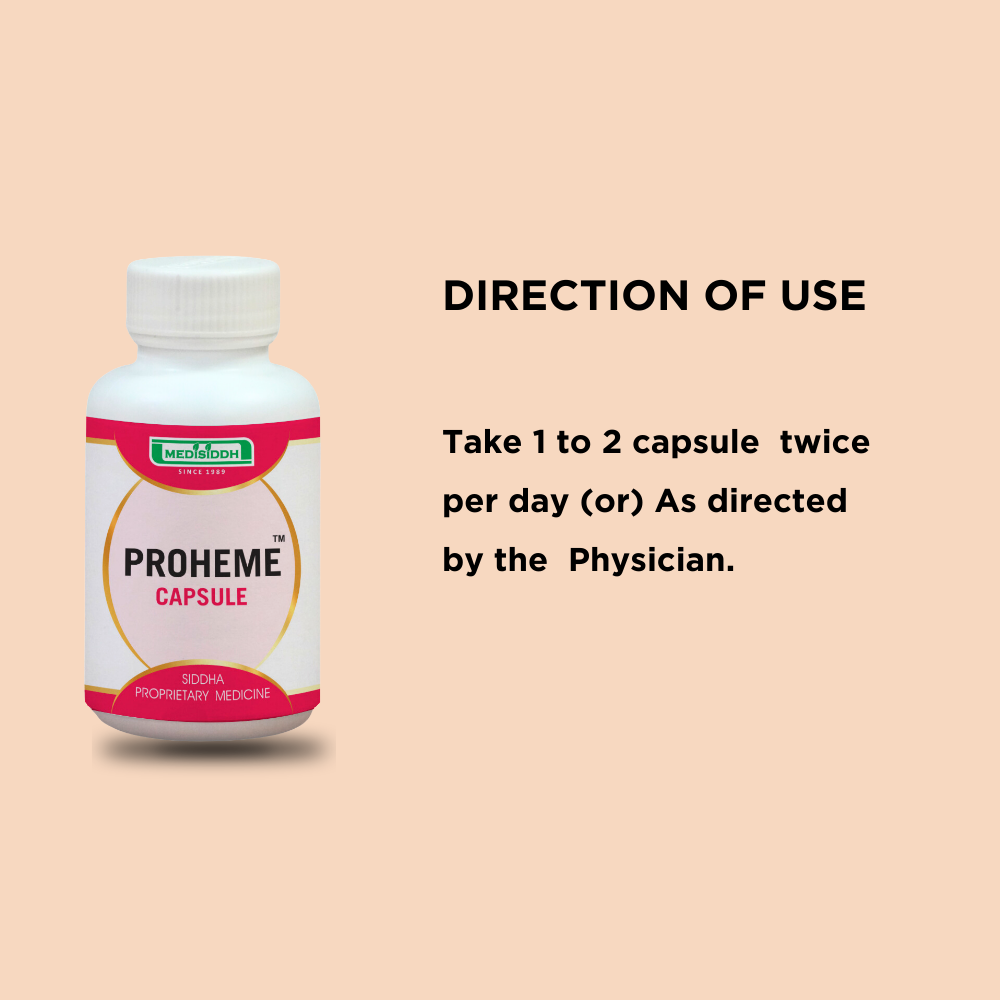 Proheme prevents the loss of cellular nutrients and promotes their absorption from gastro intestinal tract, corrects unknown causes of anemia,provides essential amino acids, iron, calcium vitamin C and B and B12.