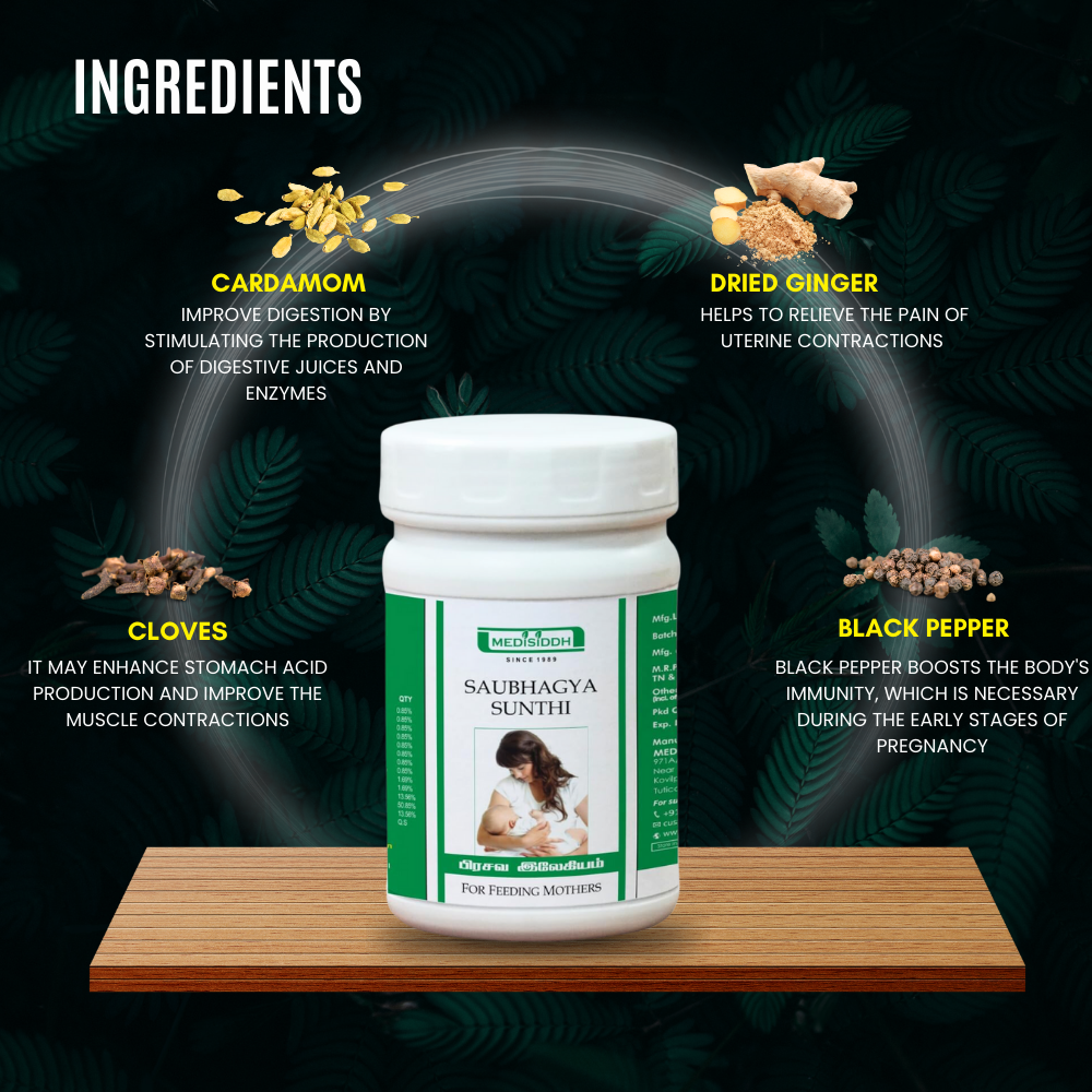 Saubhagya Sunthi Legium is an Ayurvedic formulation designed to support postnatal recovery and overall gynecological health. Its natural ingredients help restore balance in the body, particularly for women after childbirth.