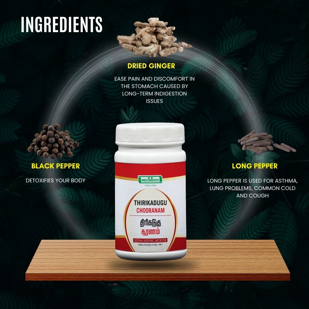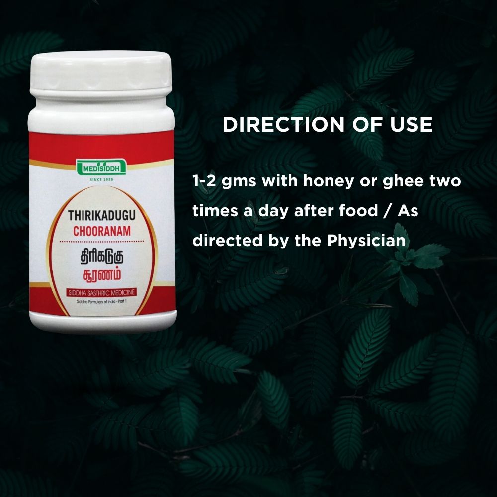 Thirikadugu Chooranam is a traditional herbal formulation crafted to promote digestive health and overall well-being. Made with natural ingredients, it supports respiratory health, boosts vitality, and encourages balance in daily life.